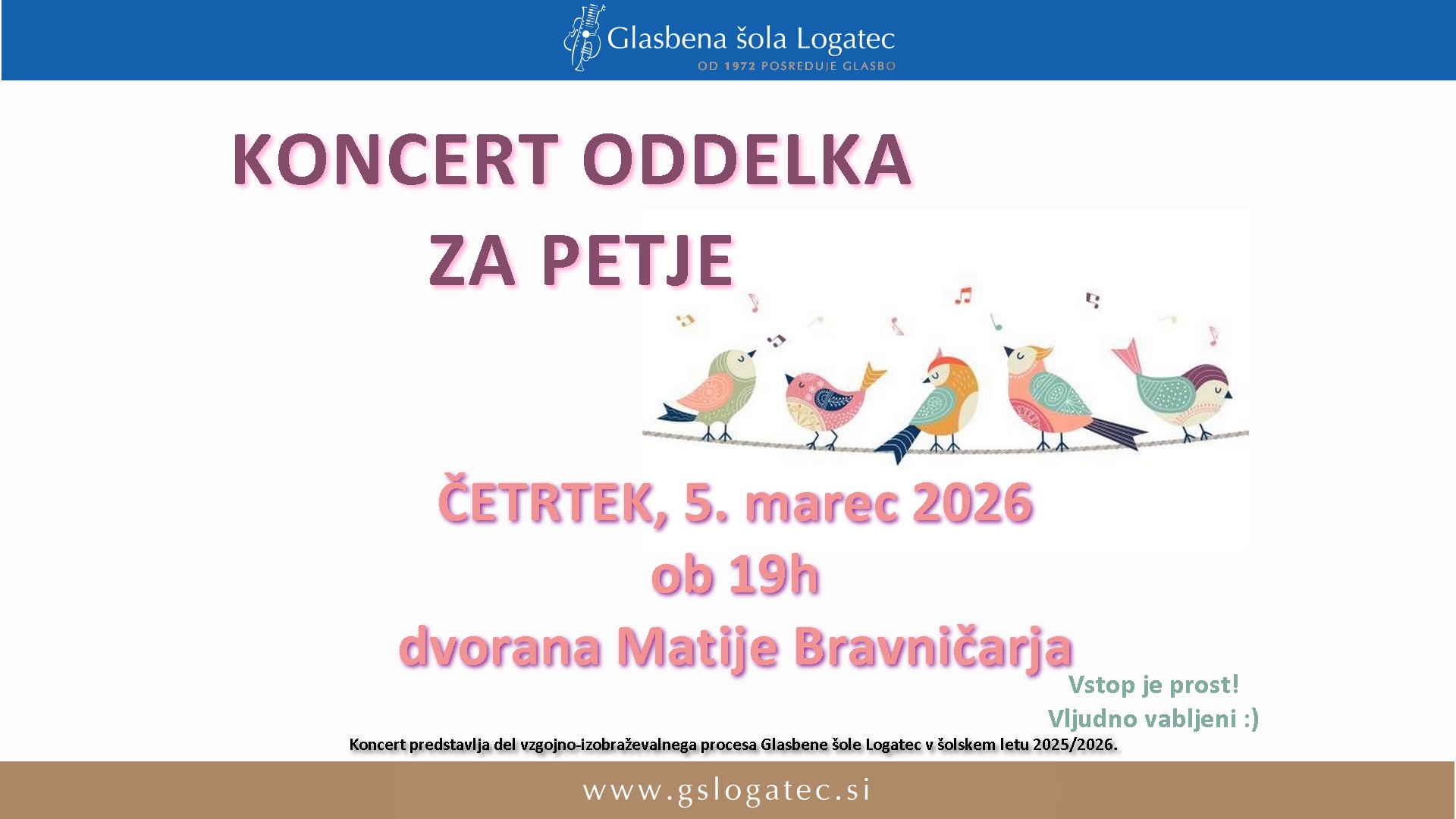 Koncert oddelka za petje Datum: 05. Marec 2026 | Ob: 19:00 Lokacija: Dvorana Matije Bravničarja Nazaj na seznam dogodkov
